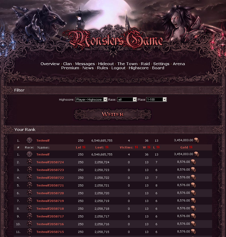 Vampiri e Lupi Mannari possono creare clan in MonstersGame (ovviamente solo mostri della stessa razza possono far parte di clan!). Usando il link "Clan" puoi sia cercare un clan esistente che sta cercando membri sia, una volta raggiunto il livello 3, creare il tuo di clan! Una volta che sei entrato in un clan o che ne hai creato uno, vedrai un menù oggetti quando cliccherai sul link "Clan". Tra questi nuovi link (come admin del clan), potrai accettare nuovi membri, potrai dare ai membri alcune autorizzazioni per il clan, o allontanare membri dal tuo clan. Puoi inoltre estendere il domicilio del clan; ogni livello aggiunto del domicilio del clan aumenta il potenziale numero di membri che il clan può ospitare di 5 in 5. Per migliorare il domicilio avrai bisogno di donazioni di monete da parte dei vari membri del tuo clan.